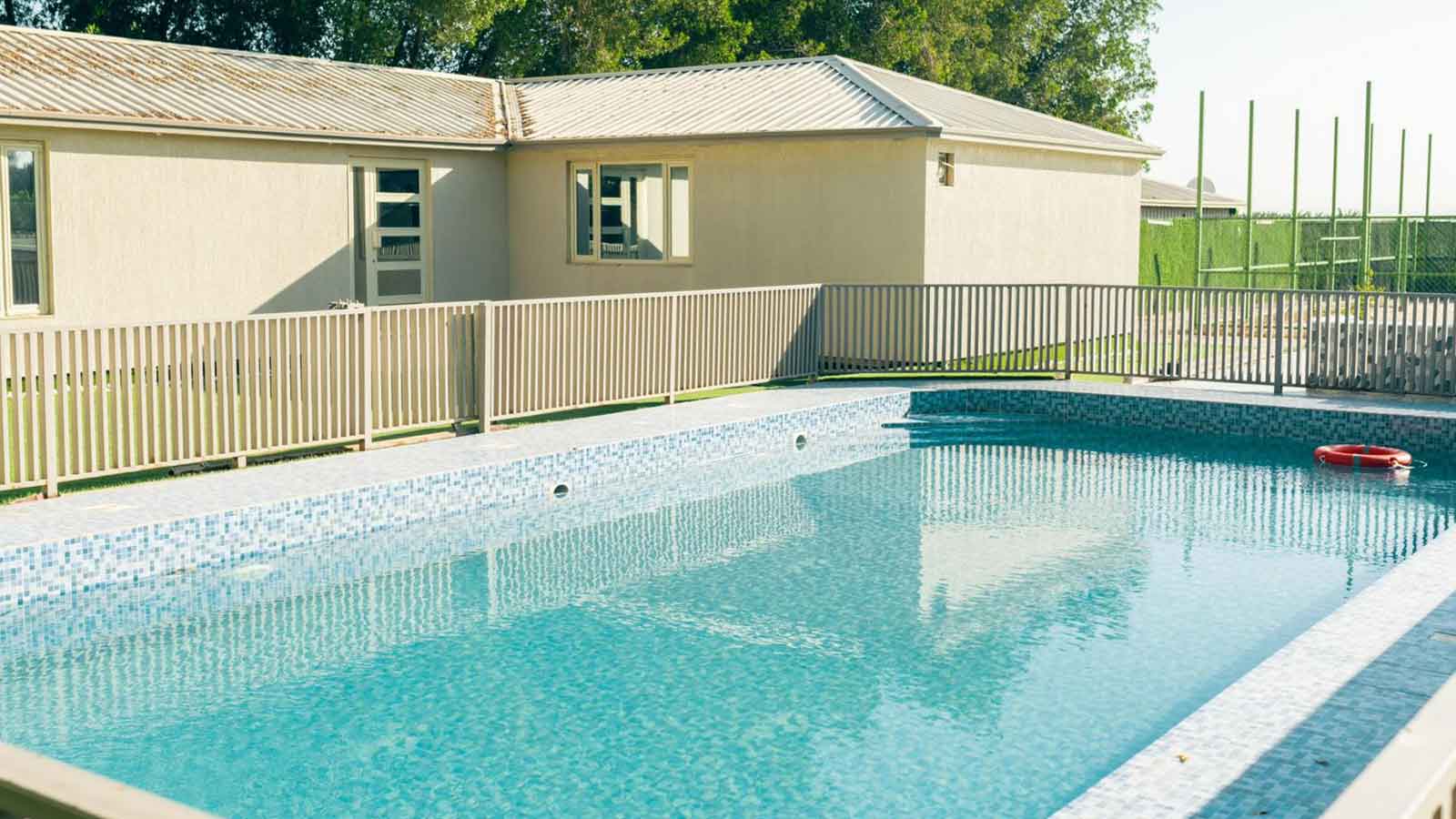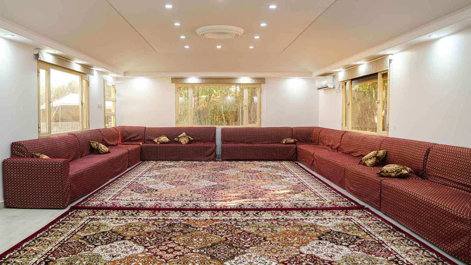 Five bedrooms, 4 bathrooms, a large hall overlooking the horse track, a kitchen, a separate Diwaniya and a bathroom for men, a swimming pool, a football field, seating areas, and an outdoor barbecue area.